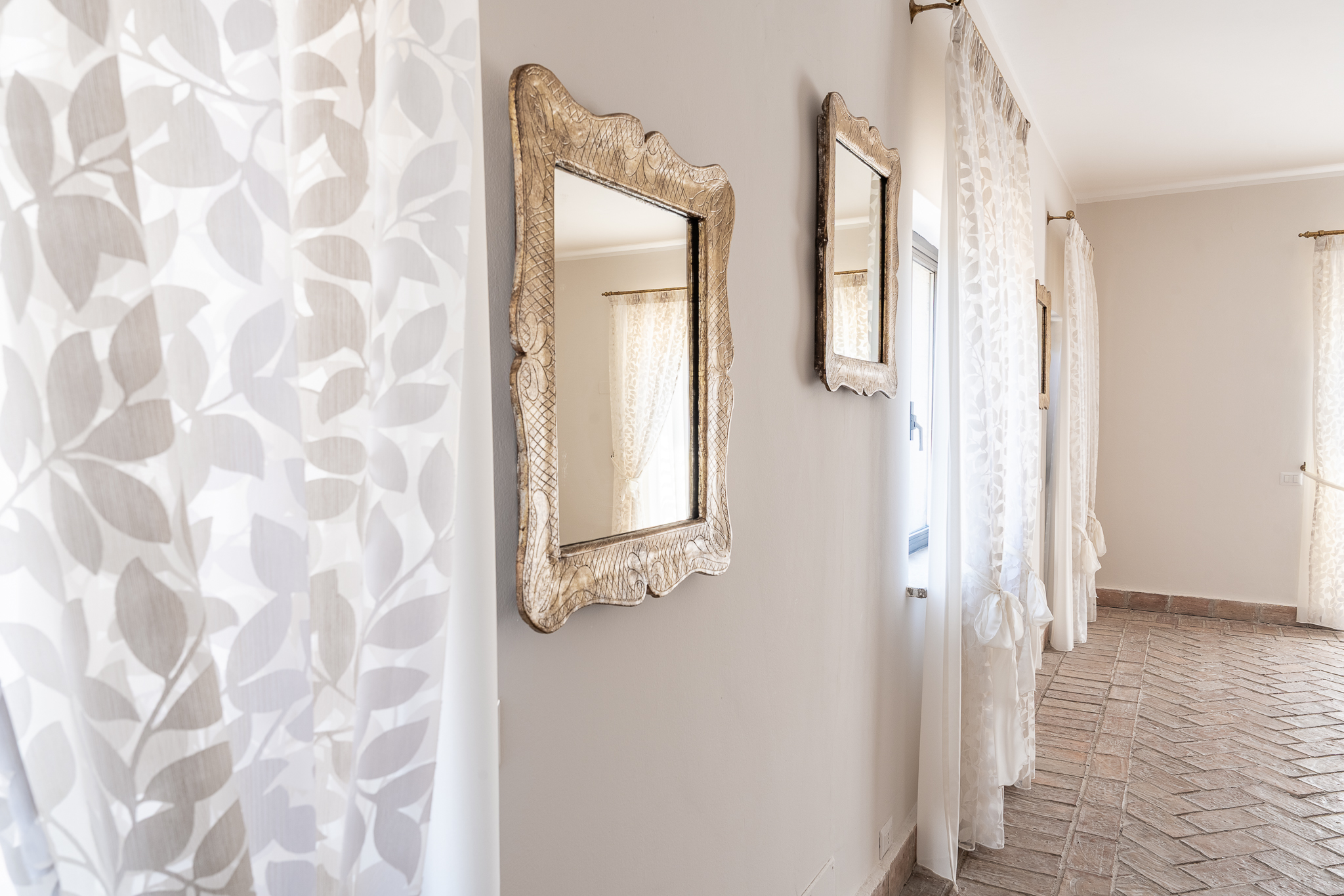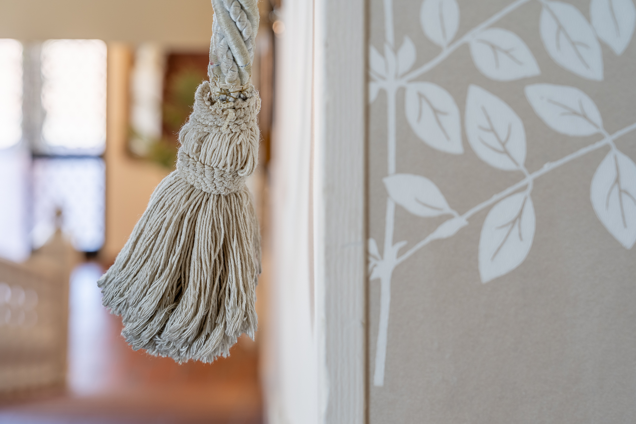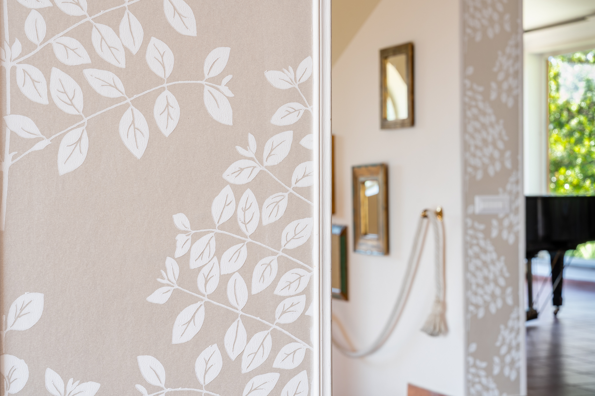 Abbiamo scelto quindi una carta da parati dai toni tenui e romantici, con un decoro a foglia elegante e minimalista, abbinato allo stesso decoro inserito nei nuovi tendaggi.